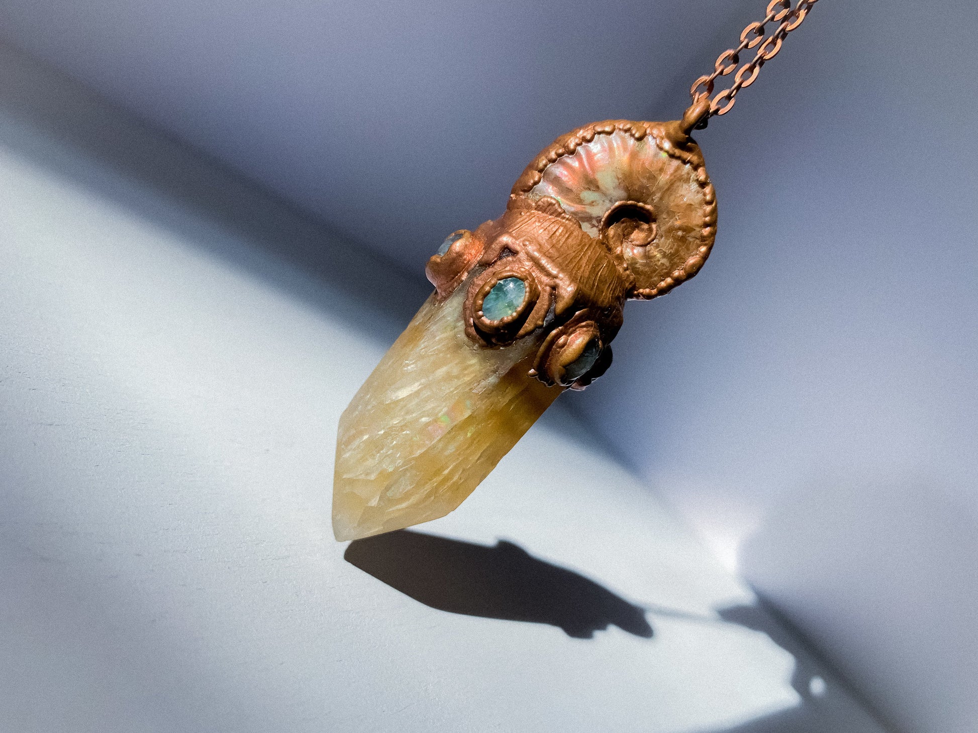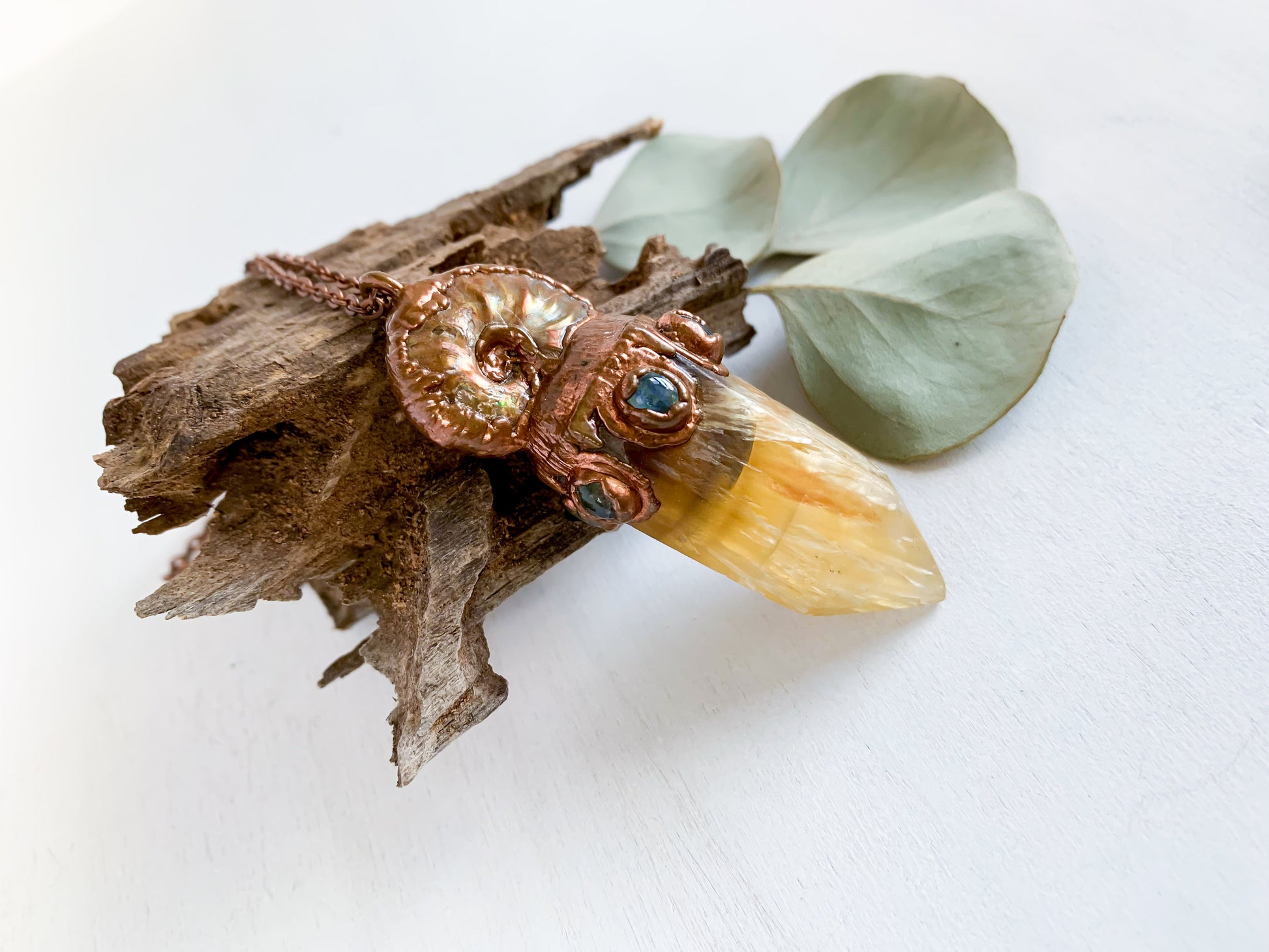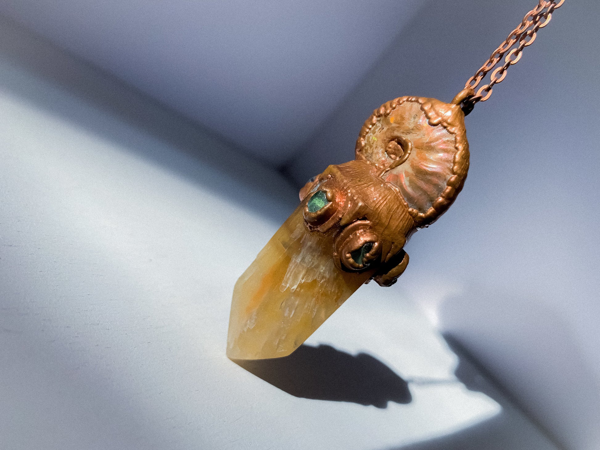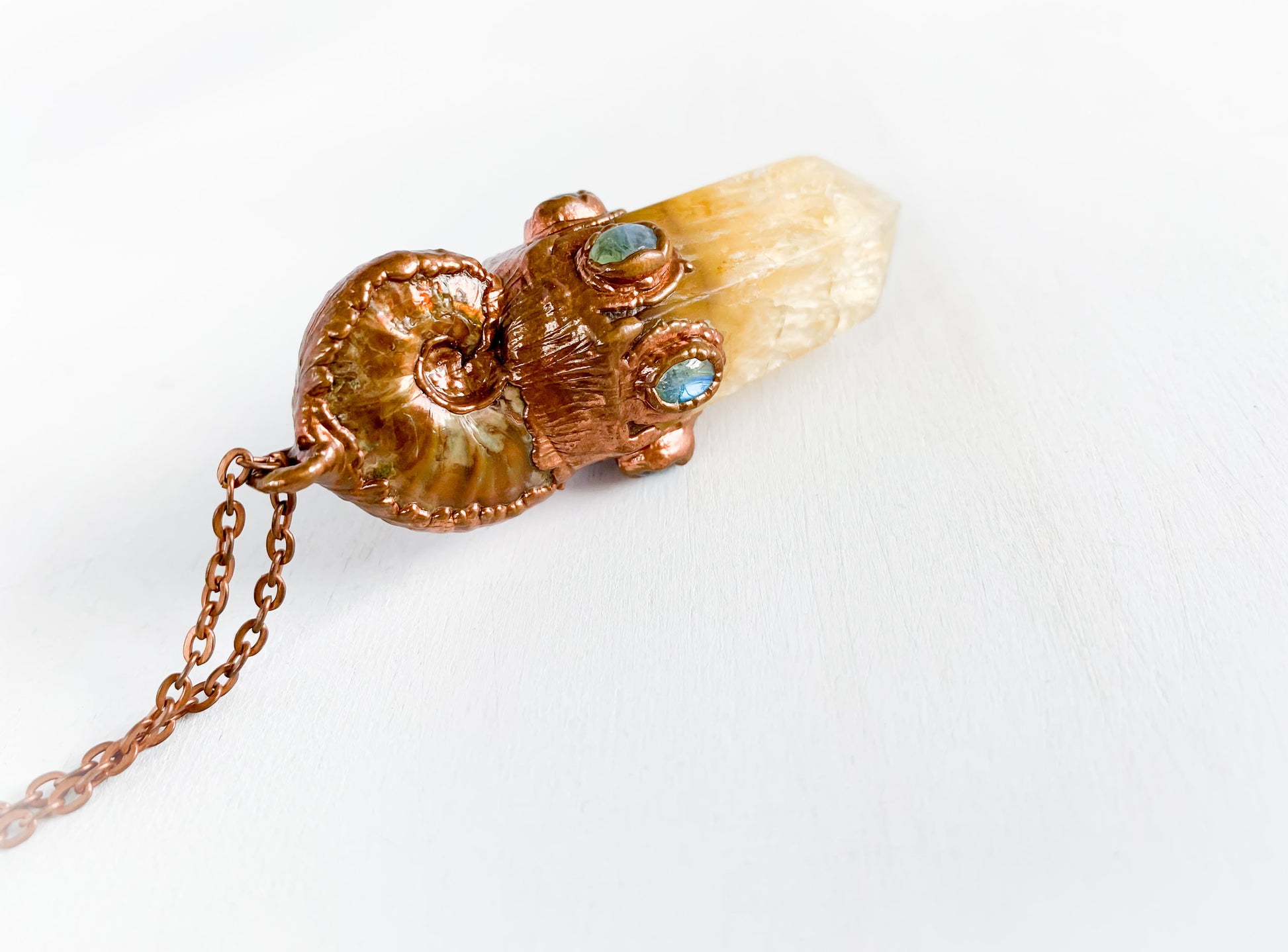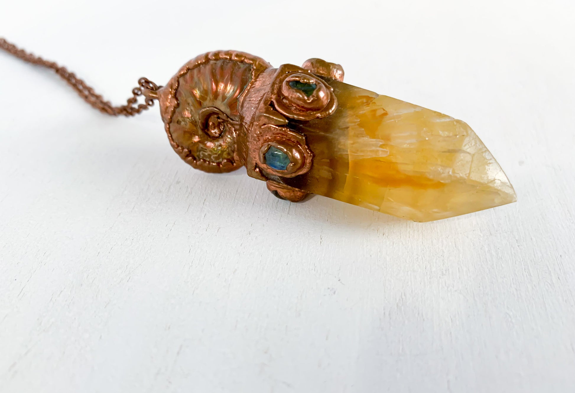This Electrofromed Copper Pendant features a gorgeous Fluorite point that has the feel of sun shining down through the water. The point is topped with a colorful Ammonite and accented all around by Moonstones. The perfect water element talisman. Easily doubles as a pendulum when taken off!