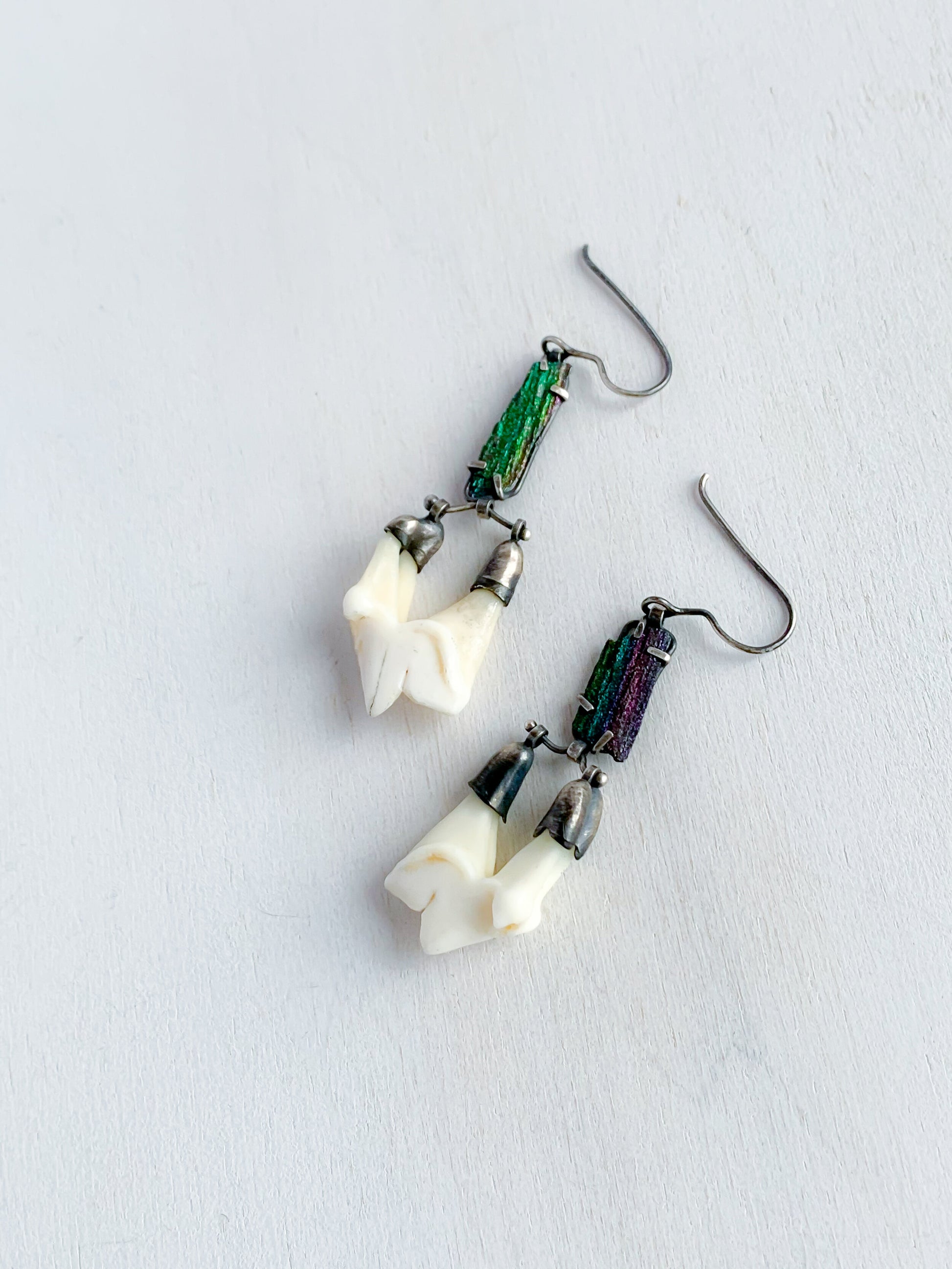 These one of a kind dangle earrings are both fabricated and cast out of Argentium Silver (.935 & Hypoallergenic). They feature slices of Rainbow Hematite and Coyote Teeth (sourced from refuse). They are kinetic and so the teeth move freely from the Hematites and the Hematites freely from the ear hooks!