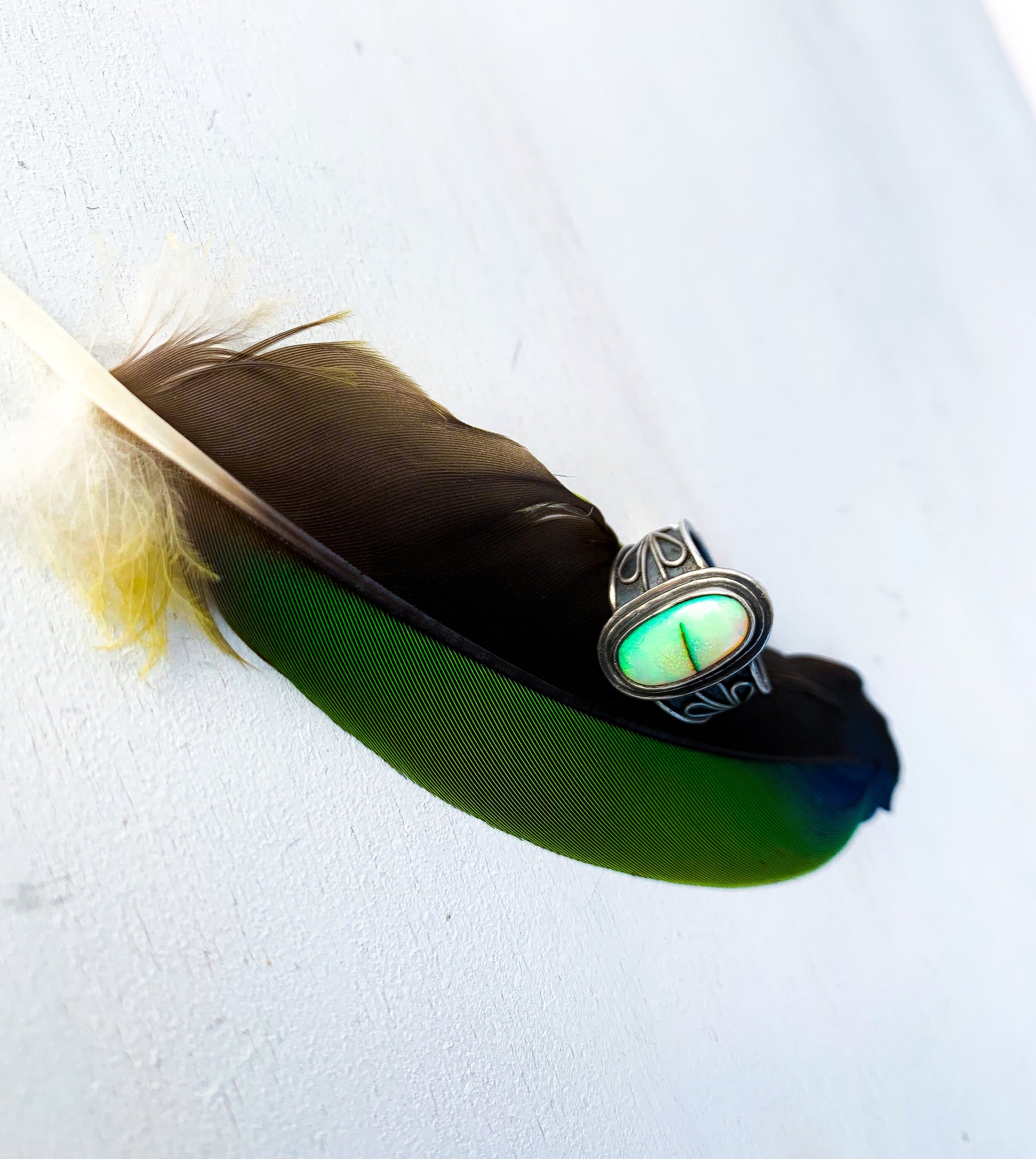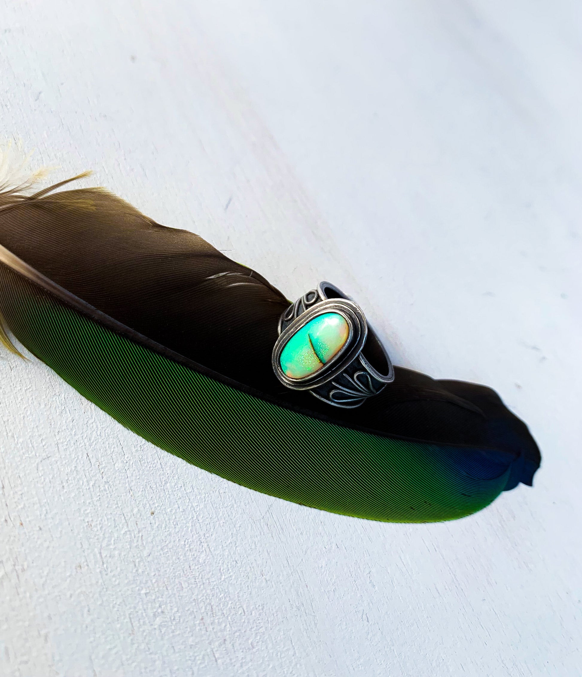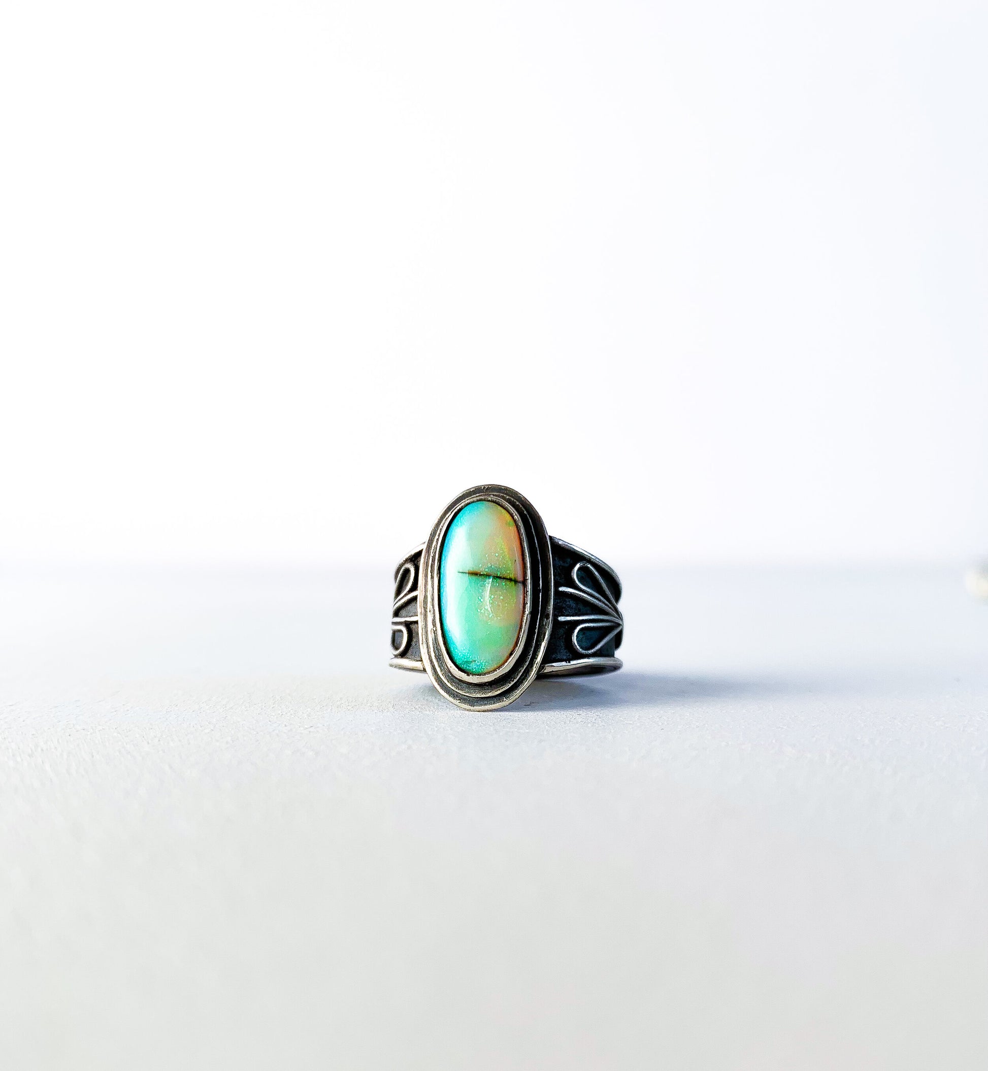Our Fluerentine Monarch Ring is each time made with a one of a kind Monarch Opal and so is unique to the person ordering it! The ring pictured features a faceted Smokey Quartz in the rear of the ring but you are able to choose between a Smokey Quartz, Garnet, or Citrine for your accent stone. We have a rotating availability of Monarch Opals on hand and so before purchasing you are welcome to email us for photos of what is available or you will be contacted with the current options once a purchase has been made. * If you are unsure that you will be happy with opal options PLEASE MAKE SURE TO EMAIL FOR OPTIONS BEFORE PURCHASING as all purchases are final.*