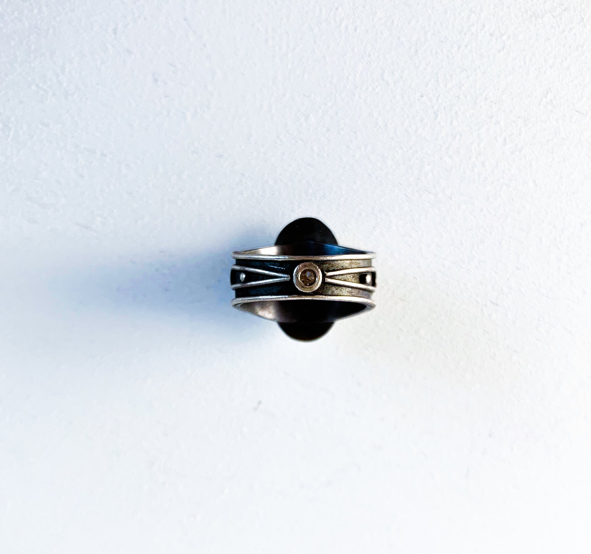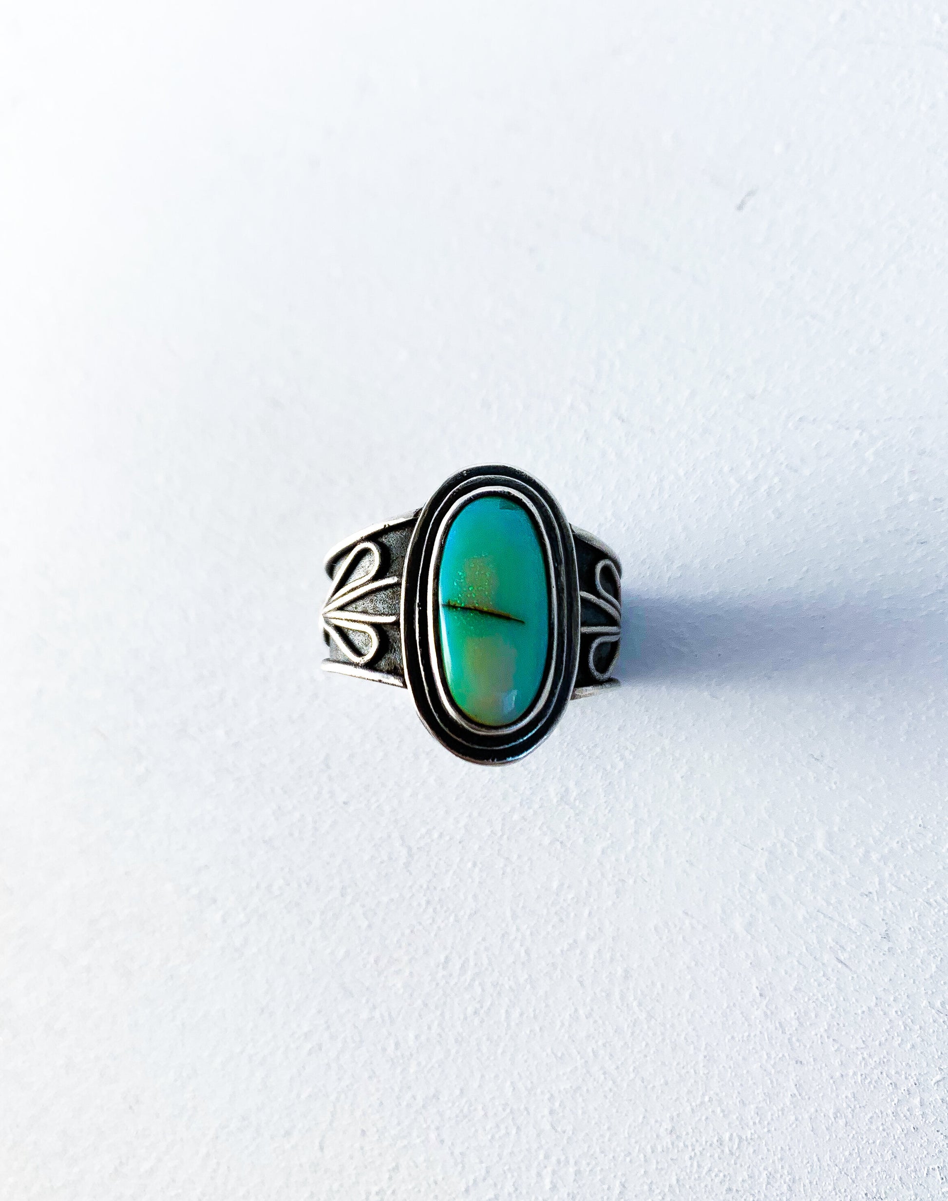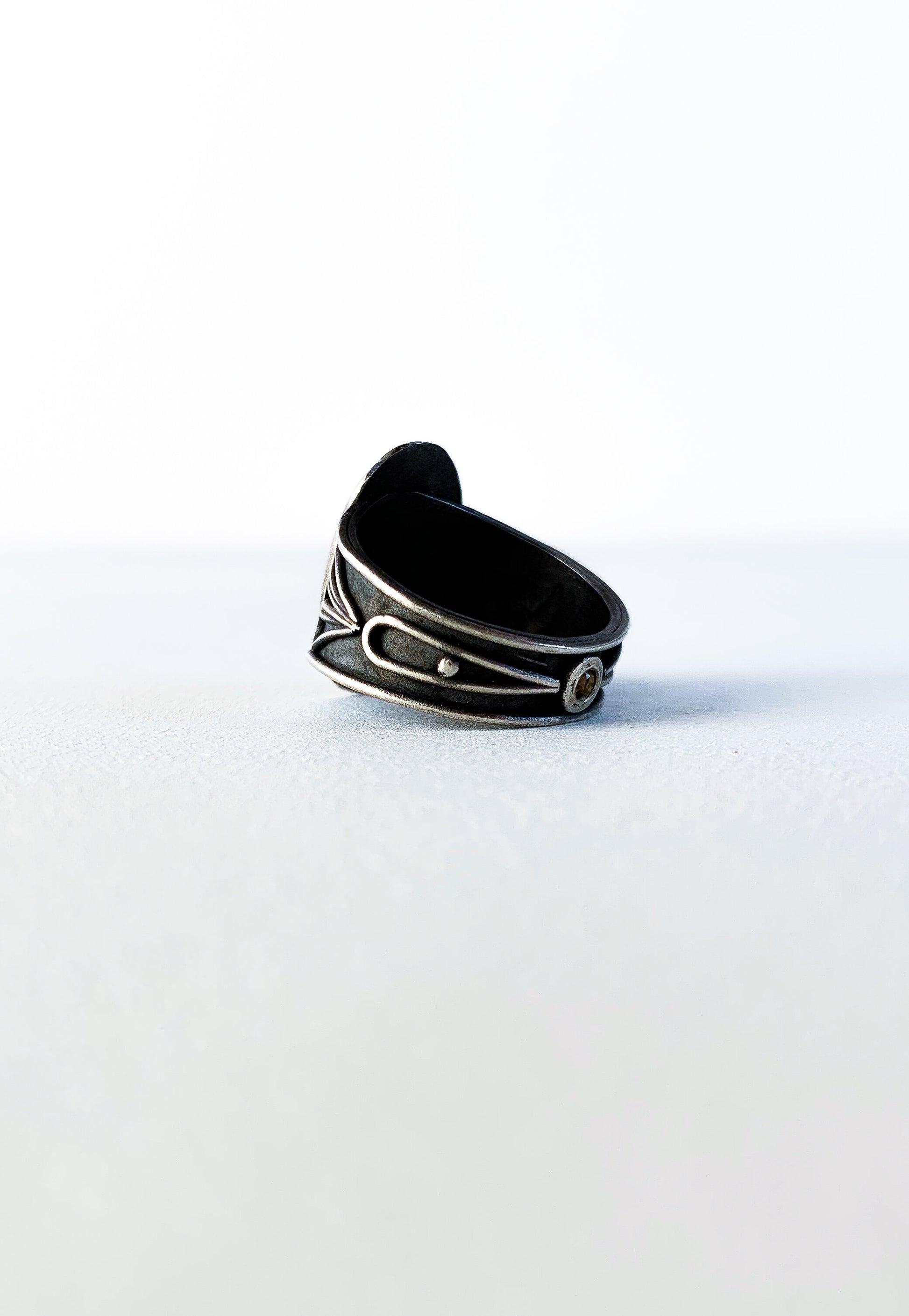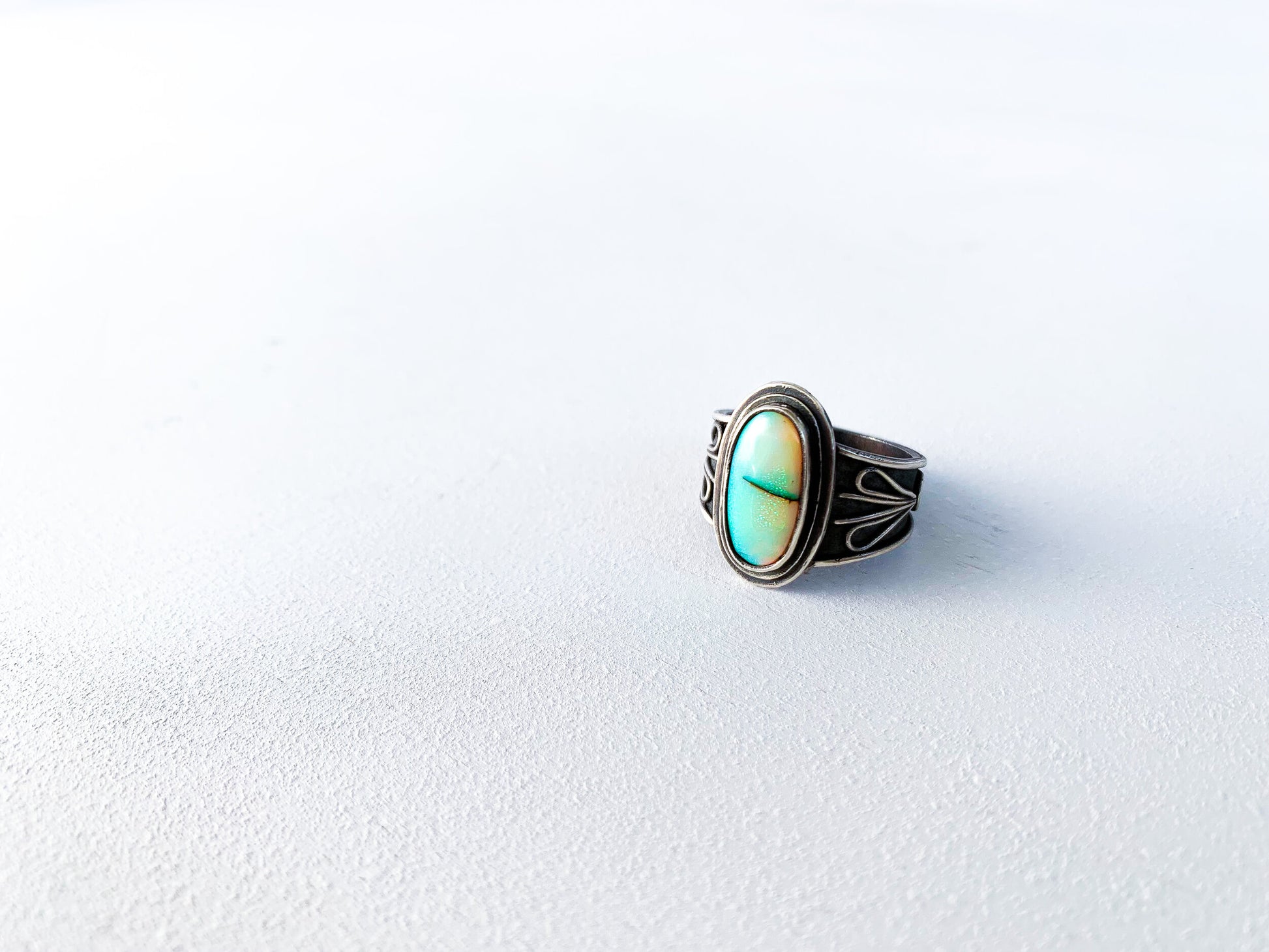 Our Fluerentine Monarch Ring is each time made with a one of a kind Monarch Opal and so is unique to the person ordering it! The ring pictured features a faceted Smokey Quartz in the rear of the ring but you are able to choose between a Smokey Quartz, Garnet, or Citrine for your accent stone. We have a rotating availability of Monarch Opals on hand and so before purchasing you are welcome to email us for photos of what is available or you will be contacted with the current options once a purchase has been made. * If you are unsure that you will be happy with opal options PLEASE MAKE SURE TO EMAIL FOR OPTIONS BEFORE PURCHASING as all purchases are final.*
