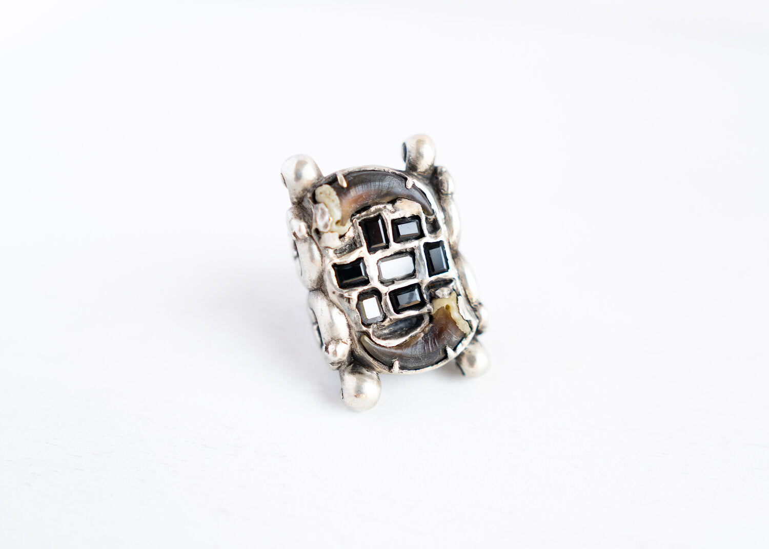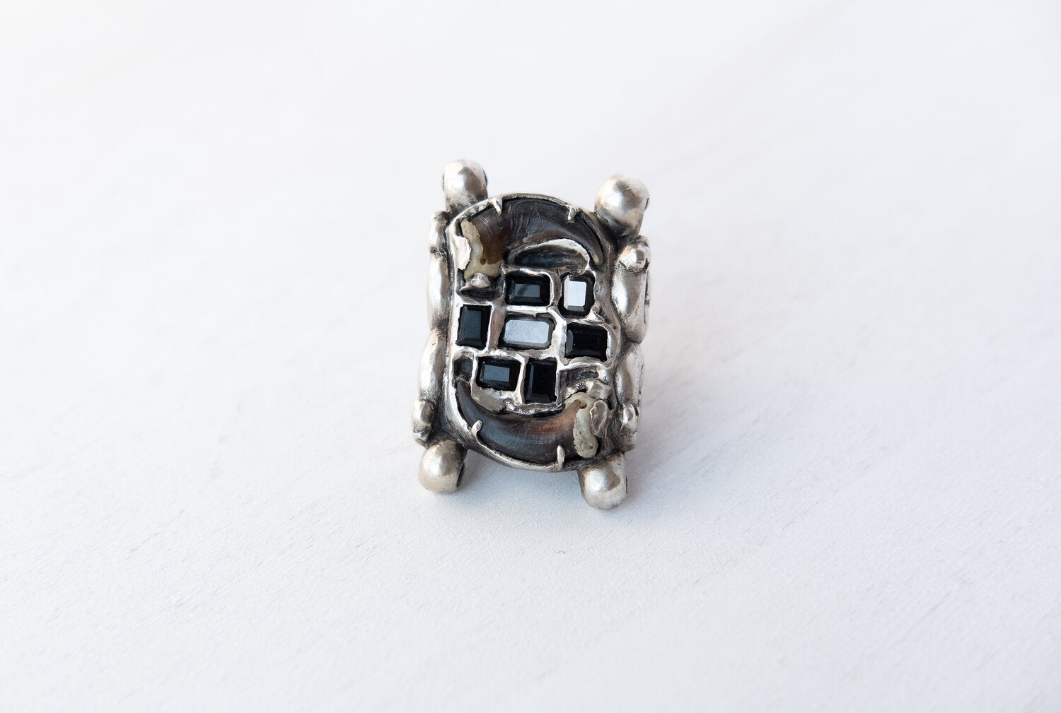 This ring was crafted free-hand carving for many many hours and finally casting, truly a labor of love. It features Coyote Claws (gathered from refuse), Onyx, and two Salt and Pepper Diamonds. It is a statement ring if ever there was a statement ring. It fits a size 7.5 and weighs about 90g in Argentium Silver (.935 & hypoallergenic)