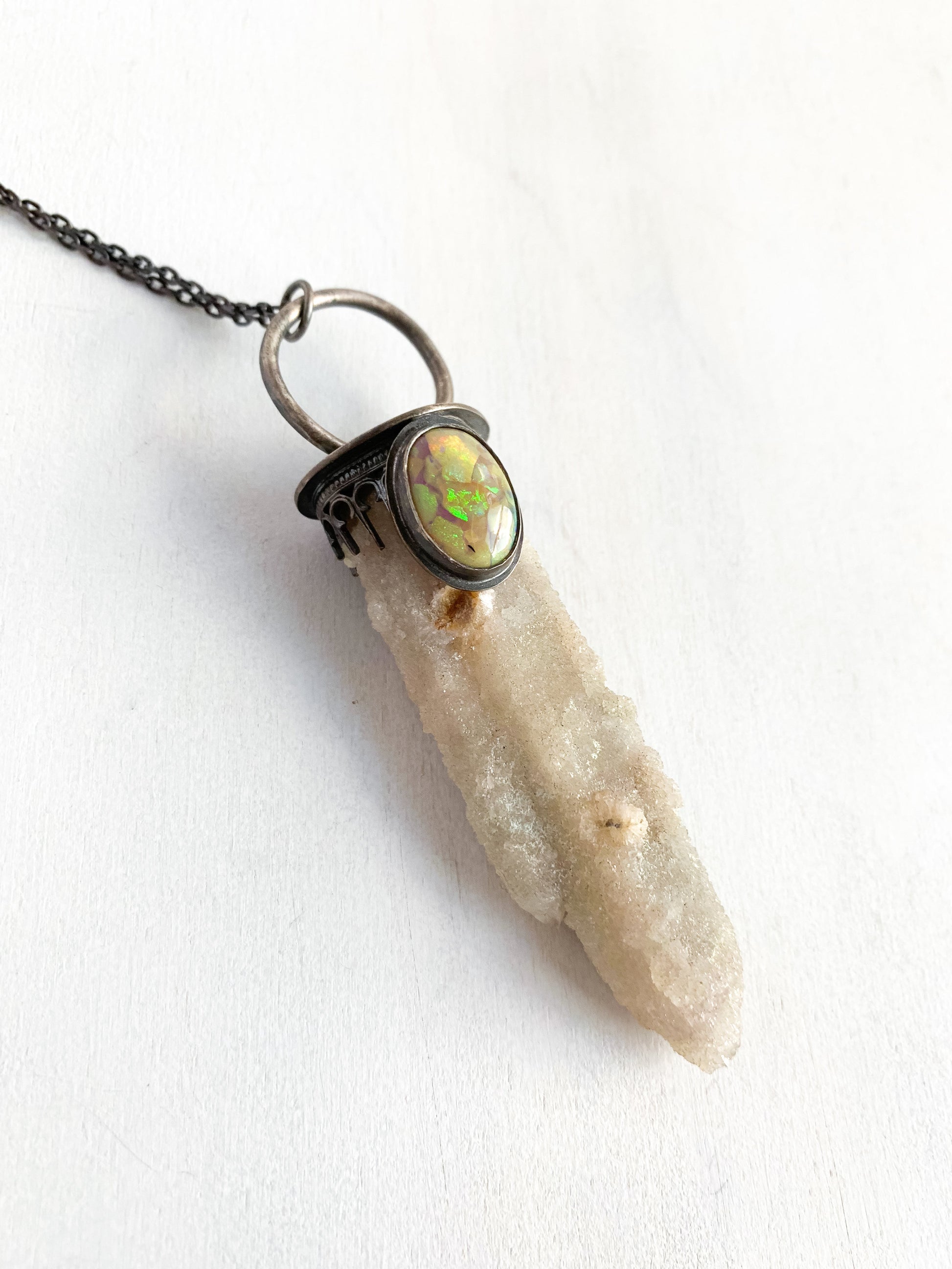 This other worldly one of a kind pendant features a gorgeous glittering Spirit Quartz tower and a color shifting Monarch Opal. It is crafted in Sterling Silver and hangs on a 24” Sterling Chain.