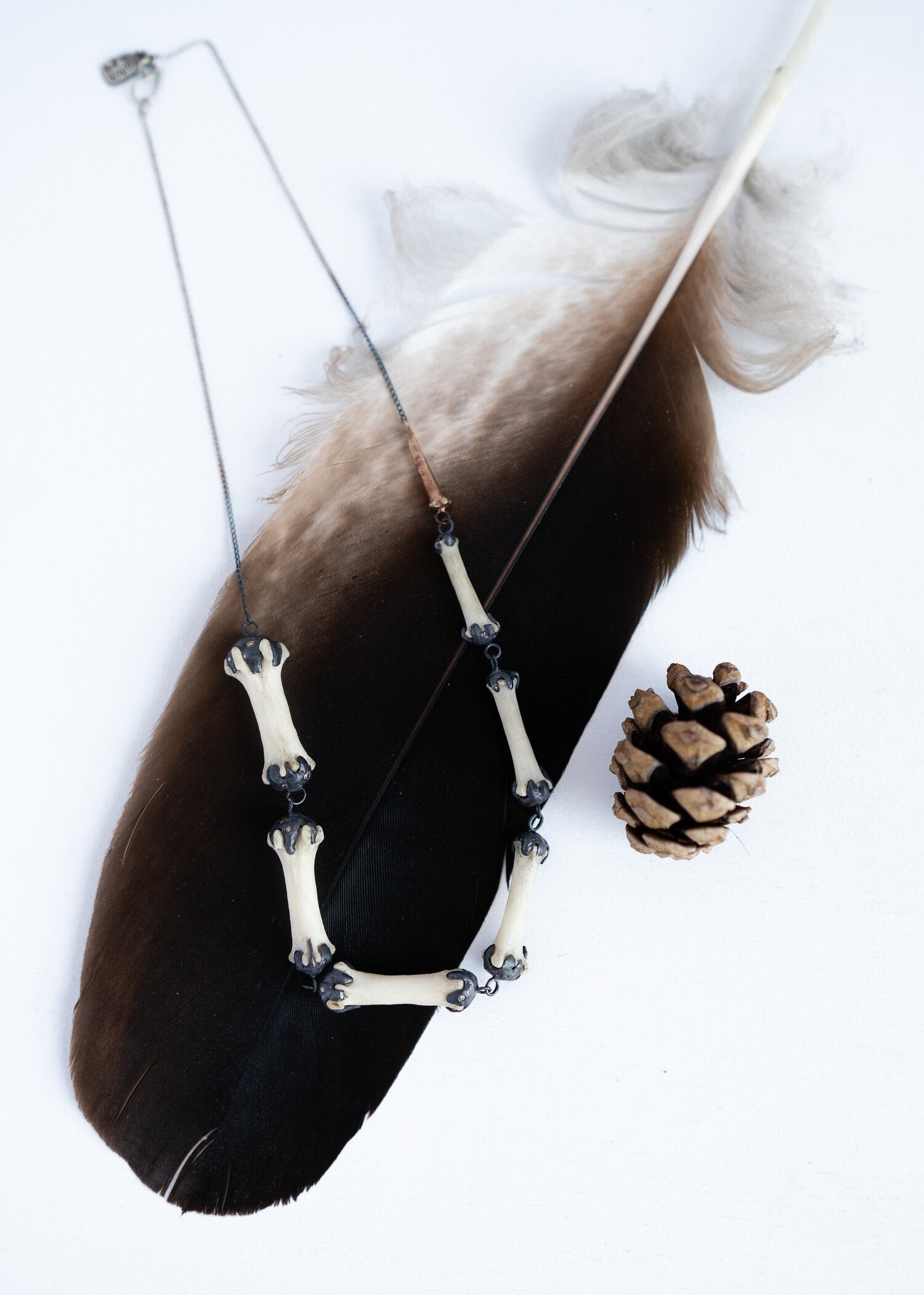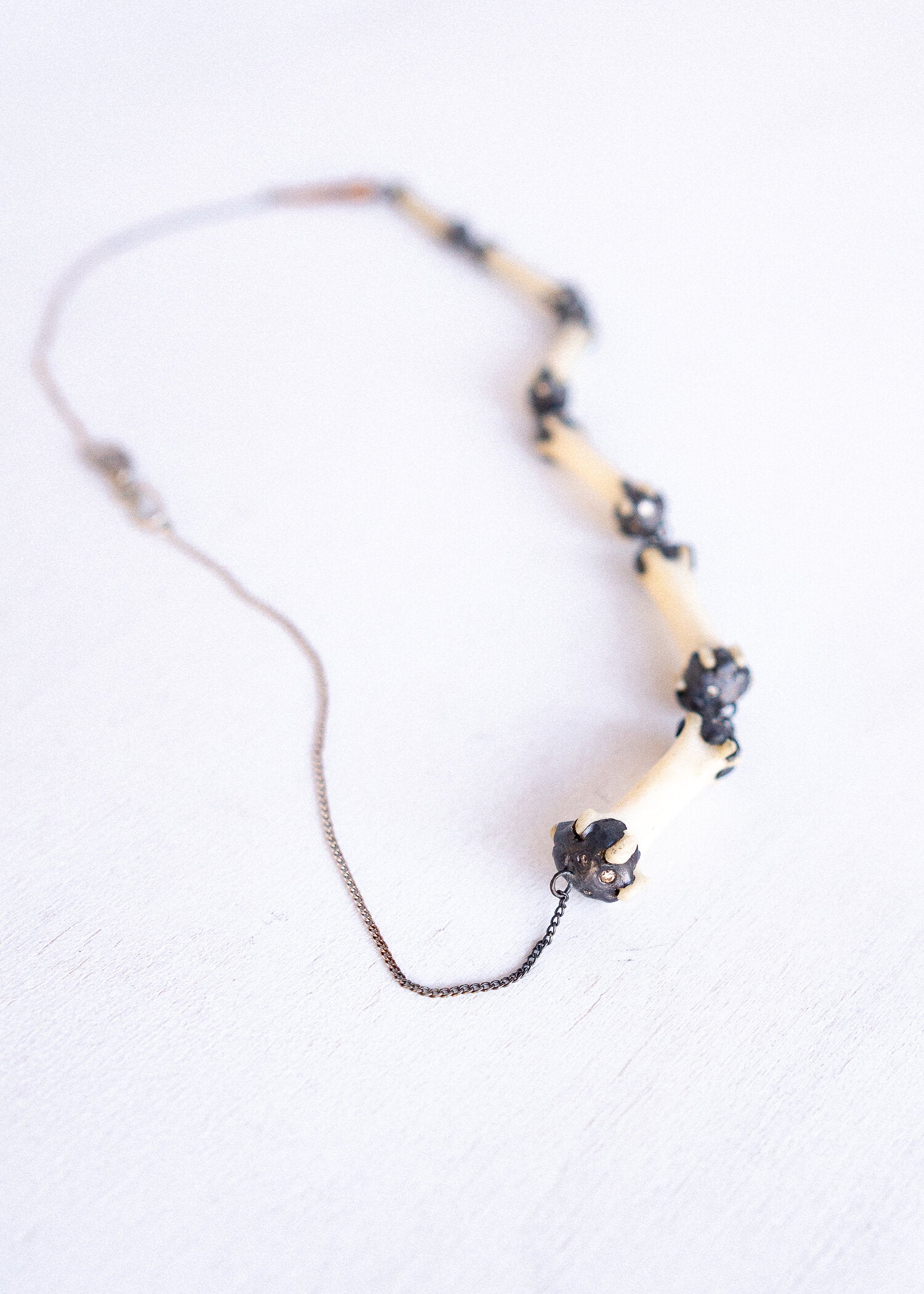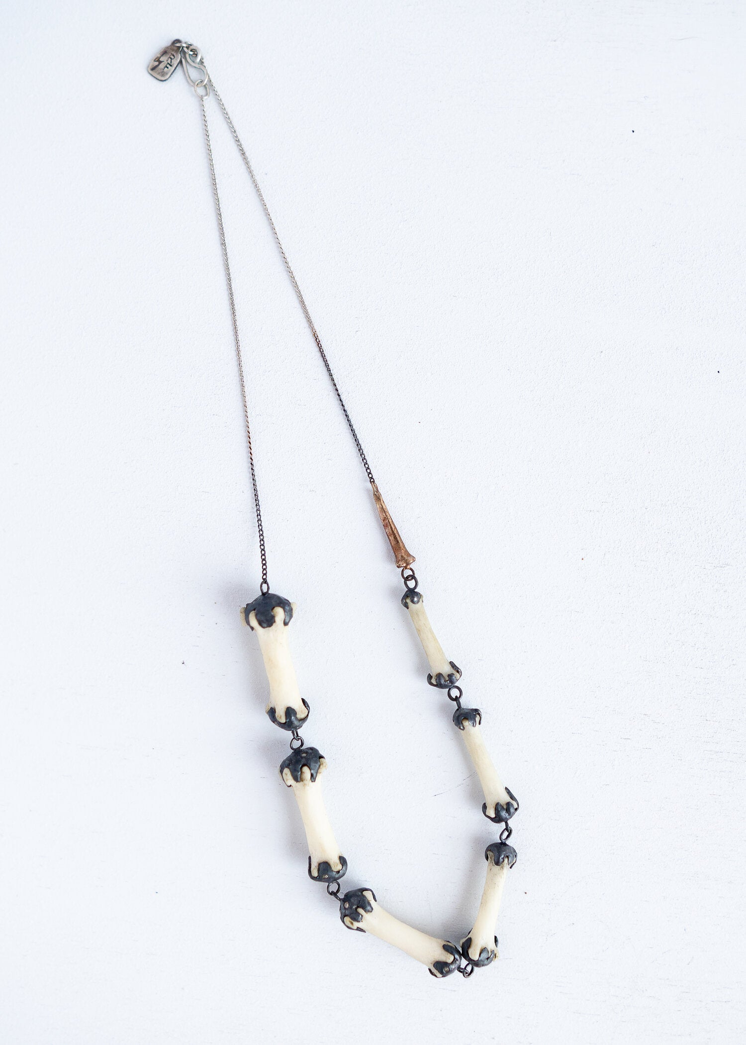 This piece features the bones of a Red Fox tail from Fire Island, NY (the fox passed of natural causes). The metal elements were cast from Argentium Silver (.935 & hypoallergenic), each piece crafted to fit each end of each bone and many of the ‘caps’ have Champange Diamonds set into the metal. The last ‘bone’ is hand carved and cast in 14k Gold. The chain is also Argentium silver and features ombre’ coloring, dark to light. This piece hangs at a 16” length.