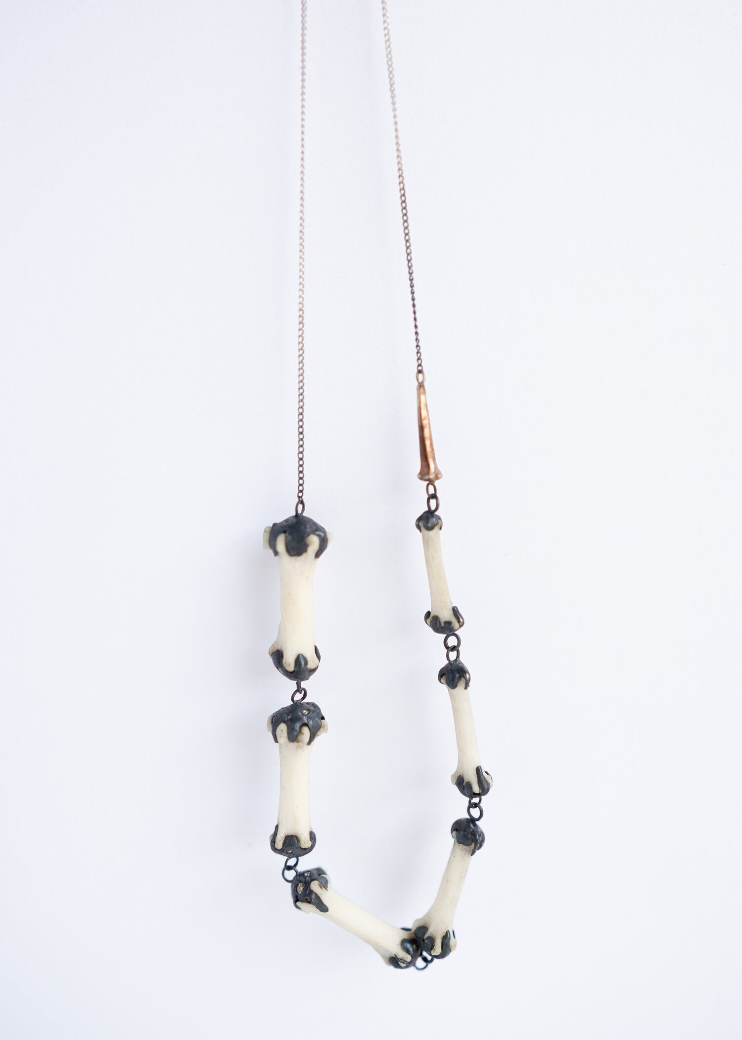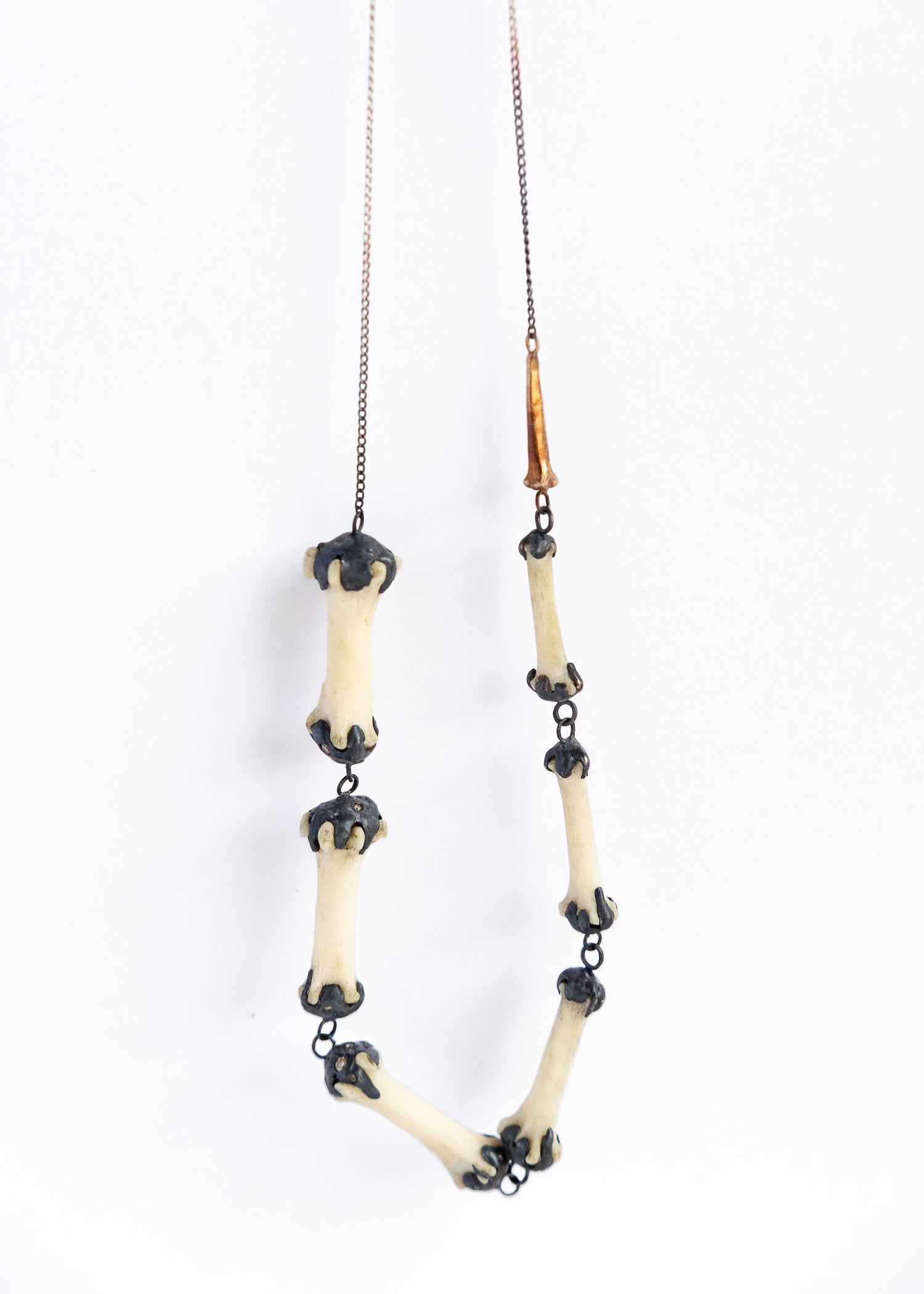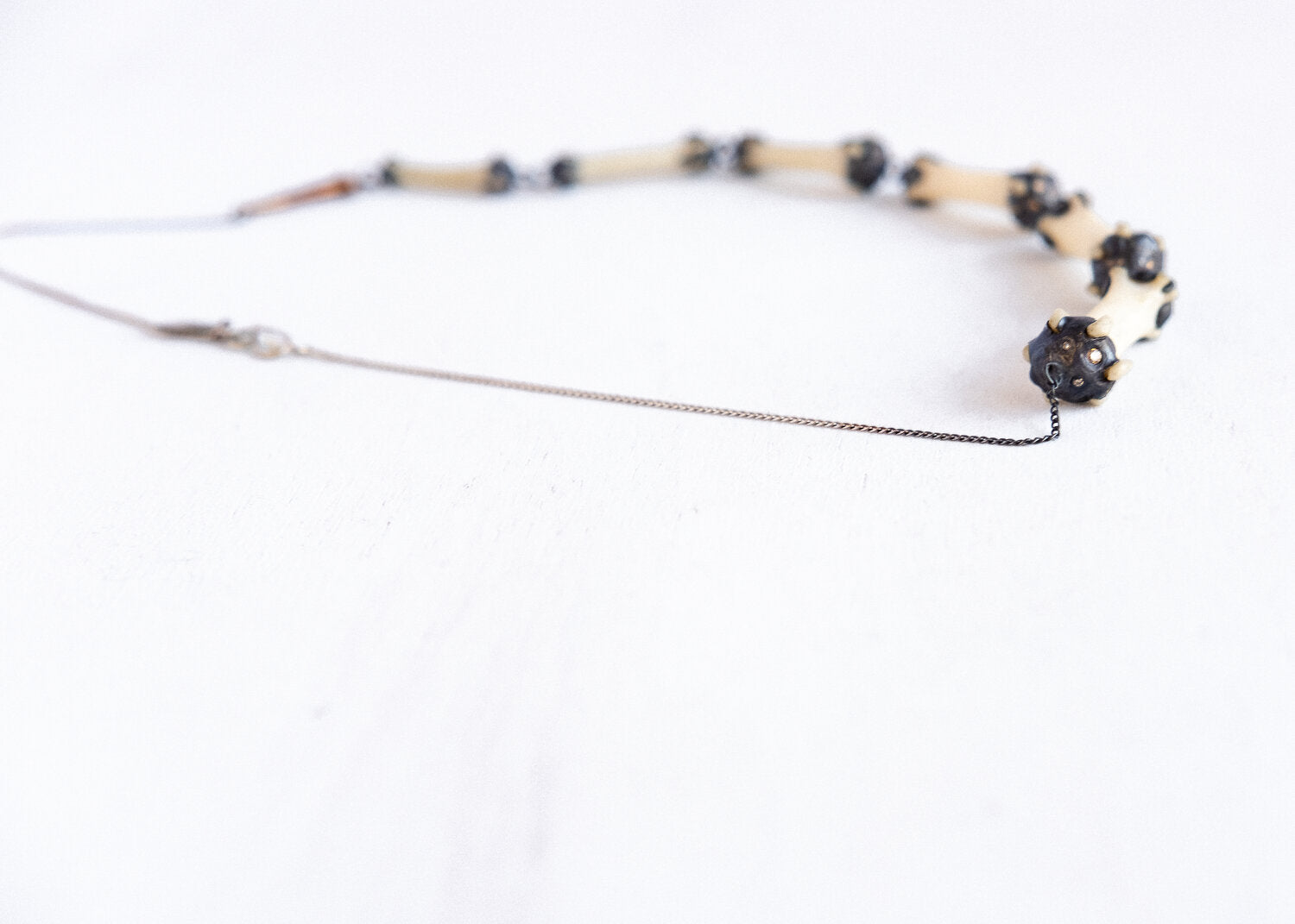 This piece features the bones of a Red Fox tail from Fire Island, NY (the fox passed of natural causes). The metal elements were cast from Argentium Silver (.935 & hypoallergenic), each piece crafted to fit each end of each bone and many of the ‘caps’ have Champange Diamonds set into the metal. The last ‘bone’ is hand carved and cast in 14k Gold. The chain is also Argentium silver and features ombre’ coloring, dark to light. This piece hangs at a 16” length.