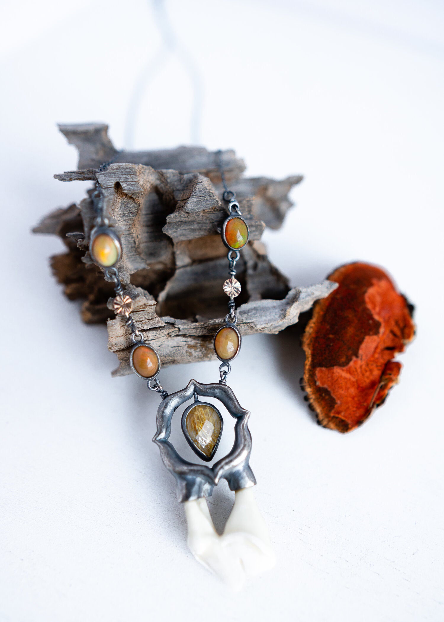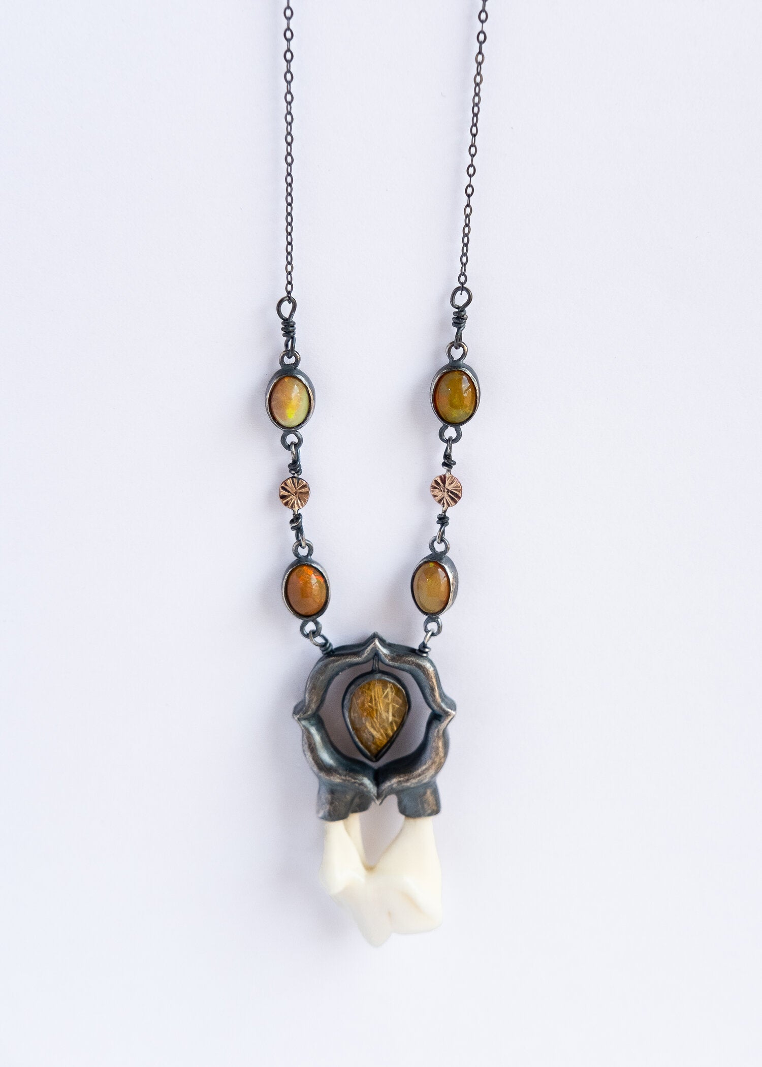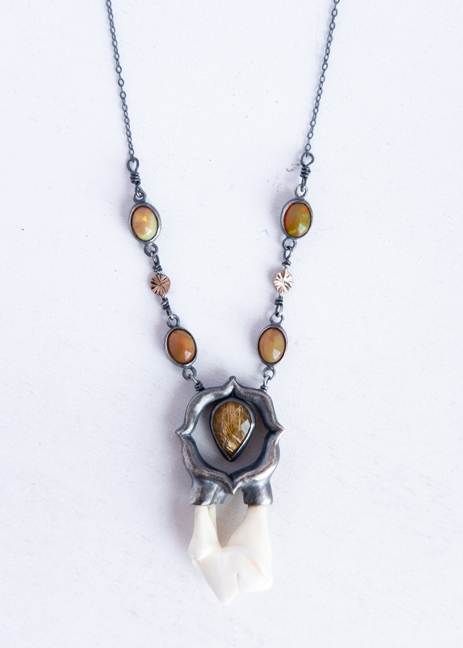 A statement necklace made of many elements! Hand carved Argentium Silver (.935) frames a spinning Rutile Quartz and leads way to a Coyote Tooth (Collected from refuse). All these elements hang from a 28” Sterling Silver chain featuring 14k Gold sunbursts and four high-grade Ethiopian Opals. The Chain is kinetic as well so you can wear the piece both ways and still see the chain details!