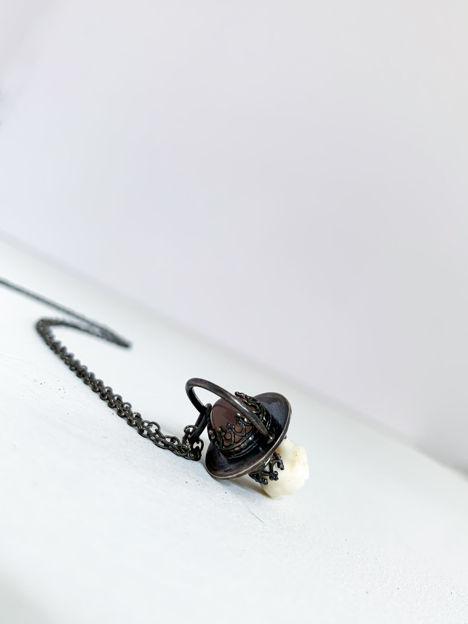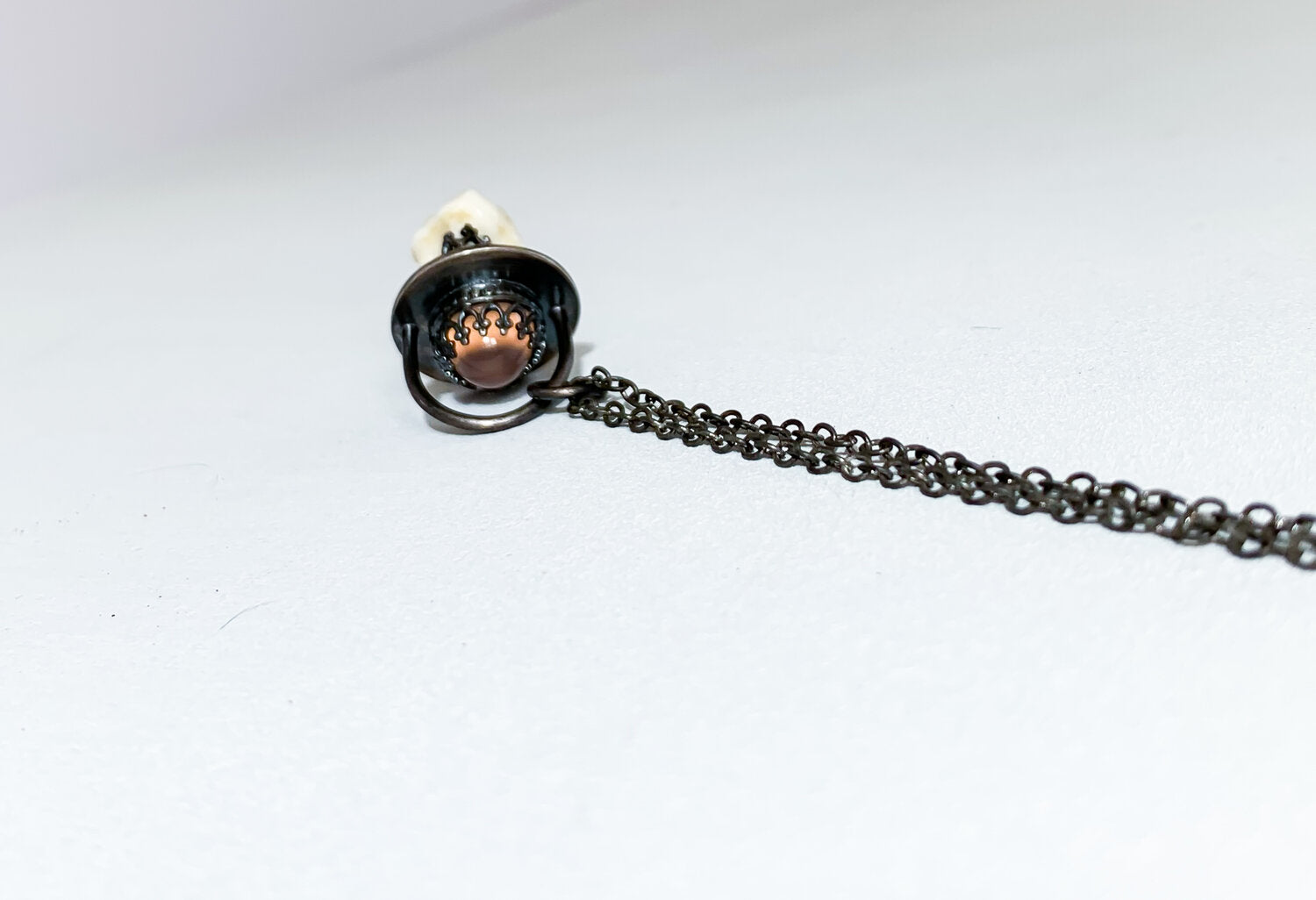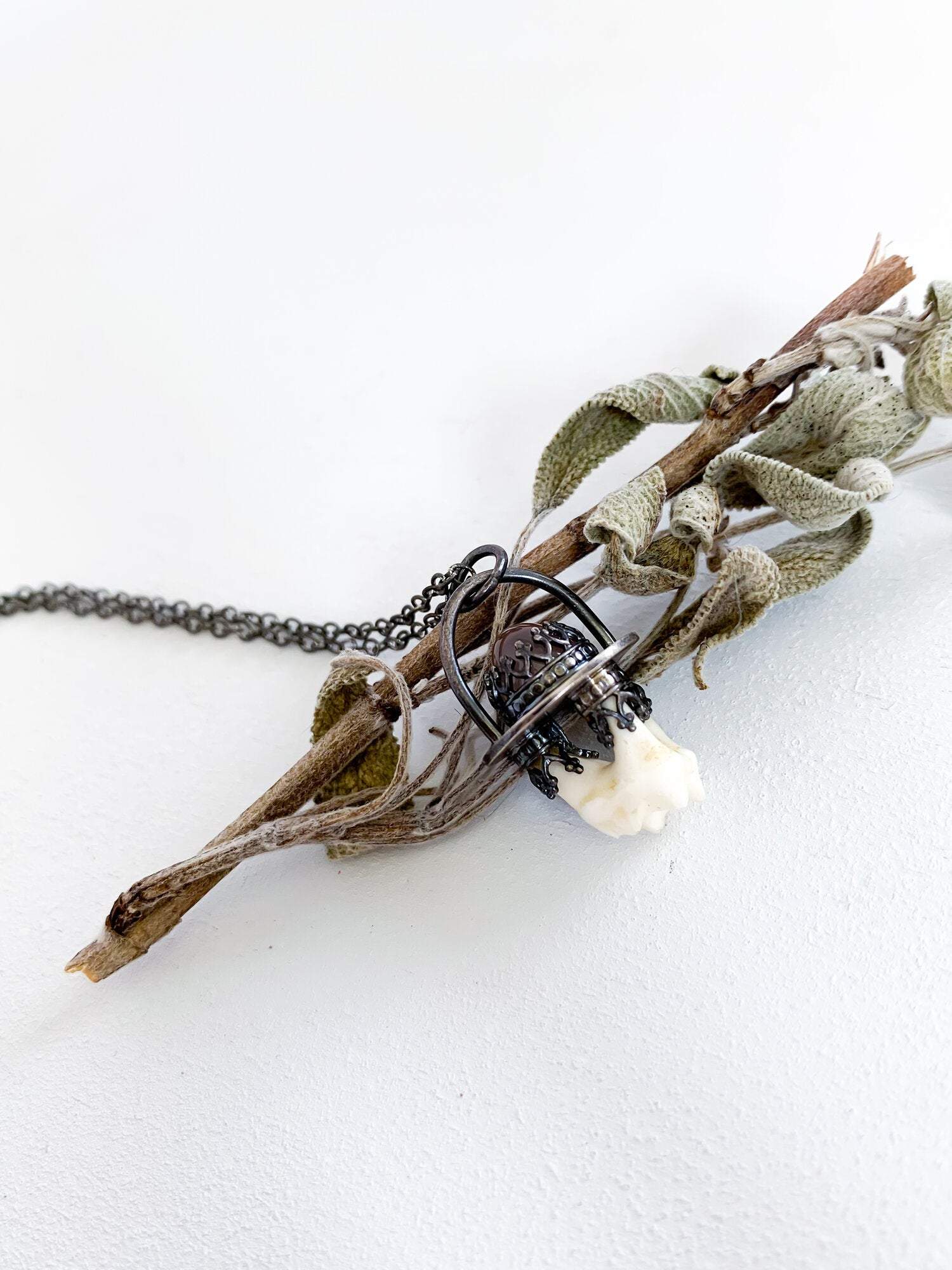 This Coyote Tooth Talisman is topped with a Pink Chalcedony and hand crafted from Sterling Silver. The Coyote tooth is sourced from refuse.