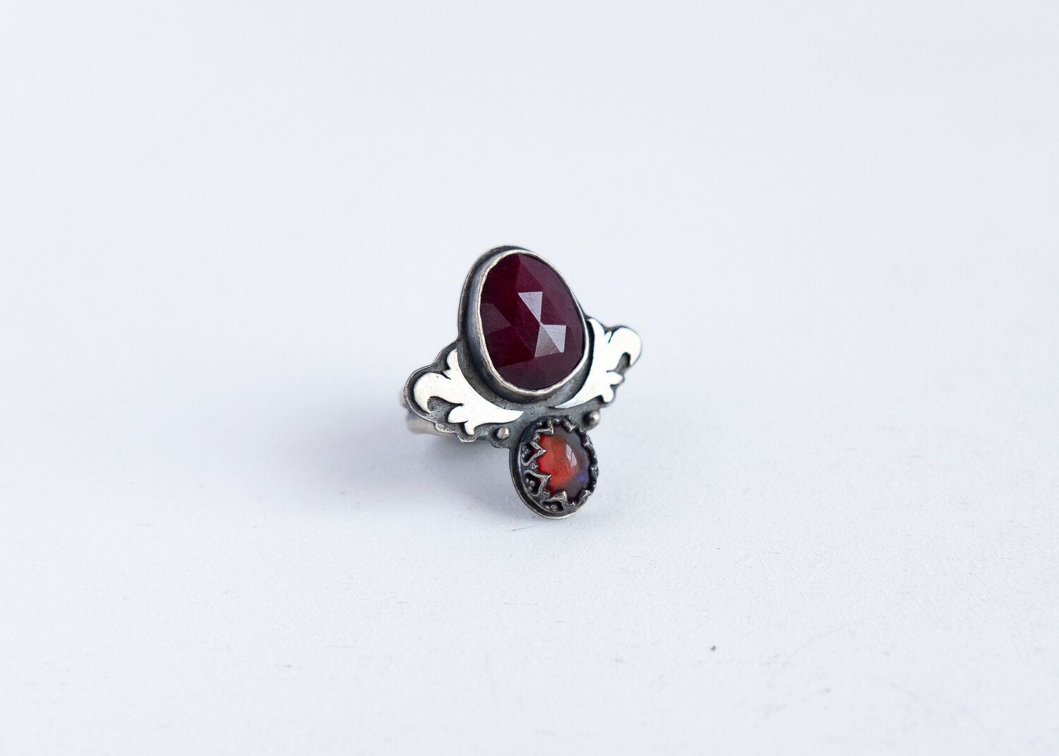A Rose cut Ruby accented with a flashy Ethiopian Opal & hand-sawed scrolls in an Argentium Silver (.935 & hypoallergenic) setting.